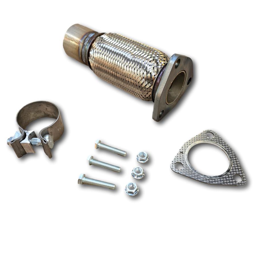 Simply cut off existing flex just past the OEM weld, slide this unit overtop and clamp or weld. We include Stainless Torca-style clamp, inlet gasket, and new bolts.